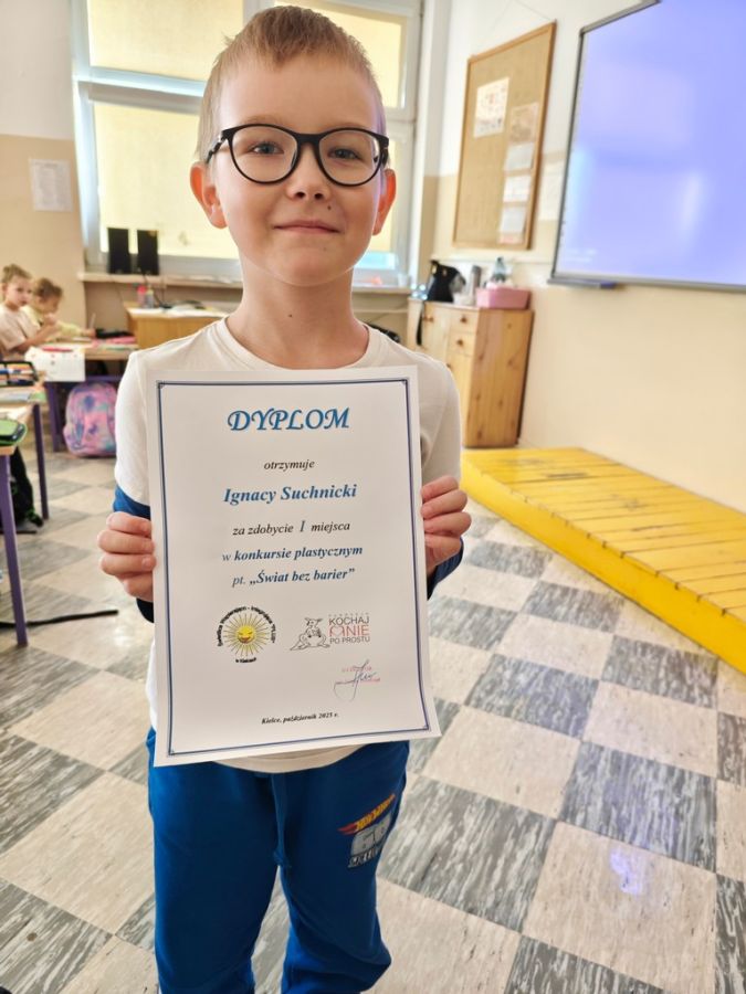 Miło nam poinformować, że w międzyszkolny konkurs plastyczny pod hasłem ,,Świat bez barier" uczeń klasy I Ignacy Suchnicki zdobył 1 miejsce. Celem konkursu było propagowania idei integracji oraz kształtowania właściwych postaw wobec osób z różnymi rodzajami niepełnosprawności. Konkurs współorganizowaliśmy wraz z Fundacją "Kochaj mnie... Po prostu".