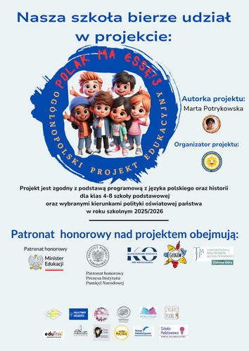 Uczniowie klas 5 wezmą udział w Ogólnopolskim Projekcie Edukacyjnym „Polak ma essę! 3”, który prowadzony jest przez Martę Potrykowską ze Szkoły Podstawowej nr 12 z Oddziałami Integracyjnymi im. Kawalerów Orderu Uśmiechu w Głogowie.