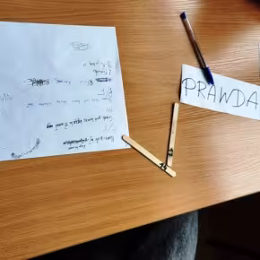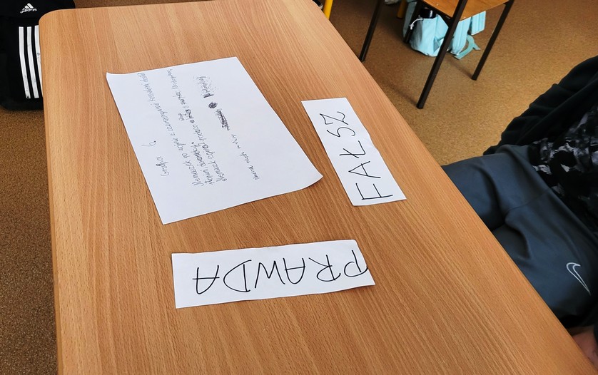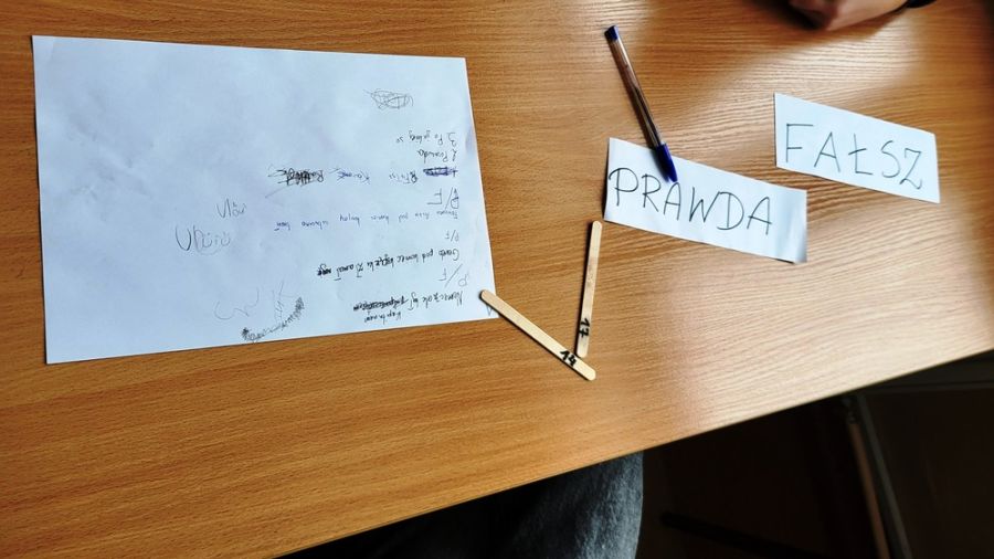 - głosowanie (na sygnał nauczycielki, wybrany przedstawiciel grupy podnosił kartkę z napisem „PRAWDA” lub „FAŁSZ”).