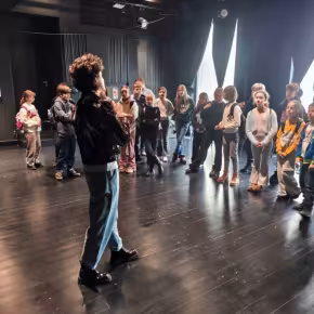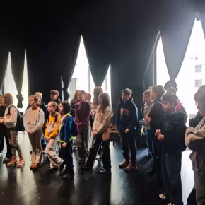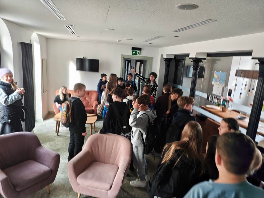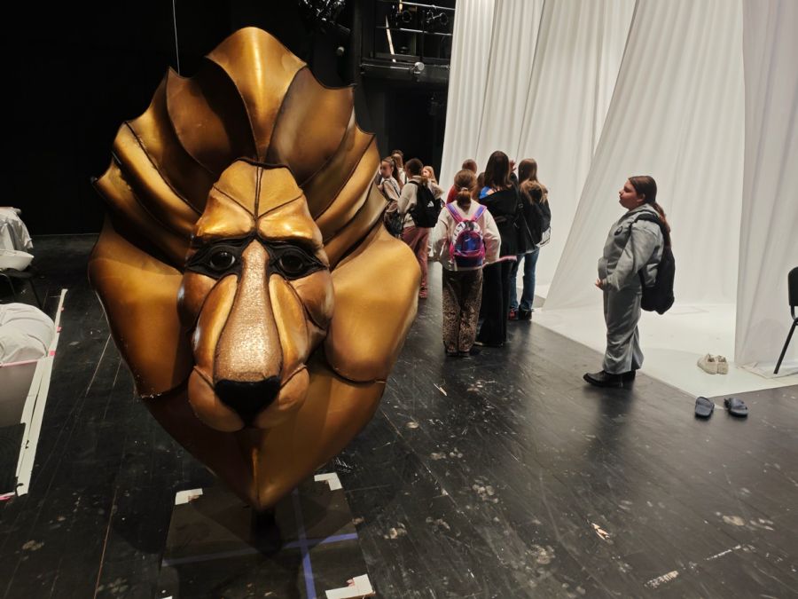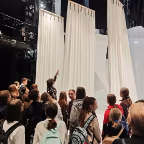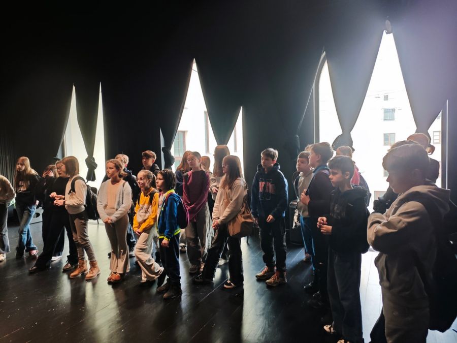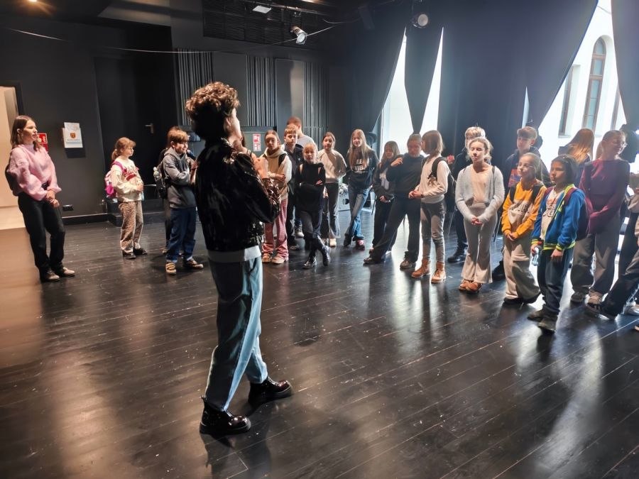 Teatralną przygodę młodzież rozpoczęła performatywnym spacerem z p. Klaudią Janas – aktorką Teatru im. Stefana Żeromskiego. Uczniowie pokonali drogę, jaką aktor odbywa na scenę – od sal prób, przez garderobę, charakteryzatornię po zaplecze Dużej Sceny. Dzieci z zaciekawieniem oglądały dekoracje, które za chwilę miały zobaczyć w przedstawieniu.